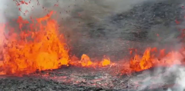 Imaginile şi videoclipurile arată lavă şi fum care se revarsă dintr-o fisură din pământ pe versantul unui munte.